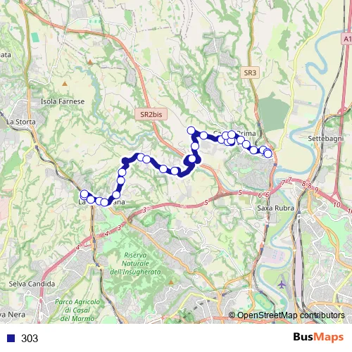 The first stop of the 303 bus route is Staz.Ne LA Giustiniana (Fl3) and the last stop is Staz.Ne Prima Porta. 303 is operational during everyday.