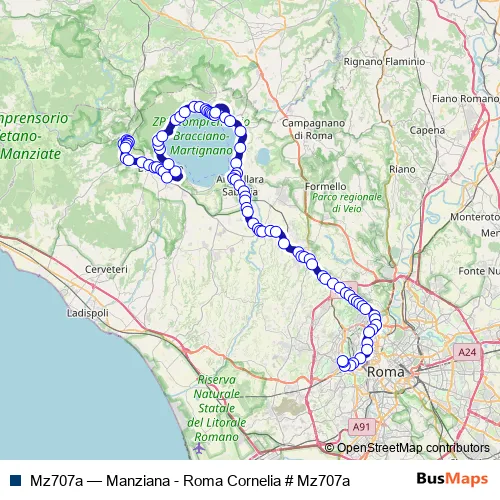 The first stop of the Mz707a bus route is Manziana | Macchia Grande # f2594 and the last stop is Roma | Capolinea Cornelia # f1. Mz707a (Manziana - Roma Cornelia # Mz707a) is operational during everyday.