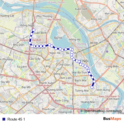 See why over 2 million users trust and consider busmaps.com as the best public transport website. busmaps gives you Hanoi Buses suggested routes, real-time bus tracker, line route maps in Hanoi, and helps to find the closest Route 45 1 bus stops near you. No internet available? Download an offline PDF map and bus schedule for the Route 45 1 bus to take on your trip.