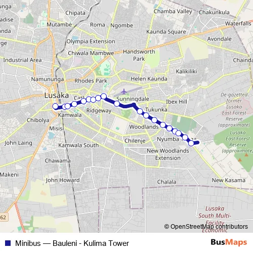 The first stop of the Minibus bus route is Kulima Tower - Chachacha Rd and the last stop is Bauleni Junction. Minibus (Bauleni - Kulima Tower) is operational during everyday.