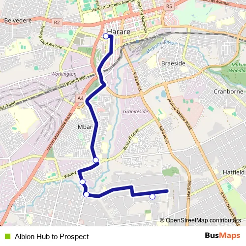 See why over 2 million users trust and consider busmaps.com as the best public transport website. busmaps gives you Harare Buses suggested routes, real-time bus tracker, line route maps in Harare, and helps to find the closest Albion Hub to Prospect bus stops near you. No internet available? Download an offline PDF map and bus schedule for the Albion Hub to Prospect bus to take on your trip.