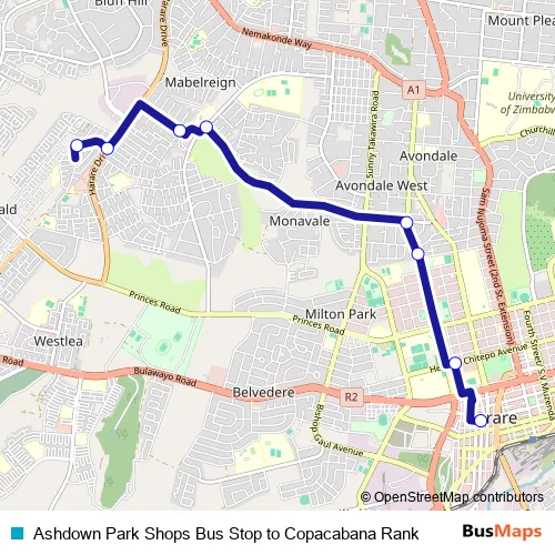 See why over 2 million users trust and consider busmaps.com as the best public transport website. busmaps gives you Harare Buses suggested routes, real-time bus tracker, line route maps in Harare, and helps to find the closest Ashdown Park Shops Bus Stop to Copacabana Rank bus stops near you. No internet available? Download an offline PDF map and bus schedule for the Ashdown Park Shops Bus Stop to Copacabana Rank bus to take on your trip.