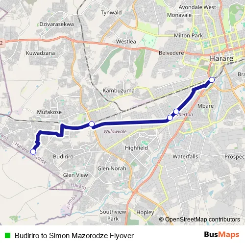 See why over 2 million users trust and consider busmaps.com as the best public transport website. busmaps gives you Harare Buses suggested routes, real-time bus tracker, line route maps in Harare, and helps to find the closest Budiriro to Simon Mazorodze Flyover bus stops near you. No internet available? Download an offline PDF map and bus schedule for the Budiriro to Simon Mazorodze Flyover bus to take on your trip.