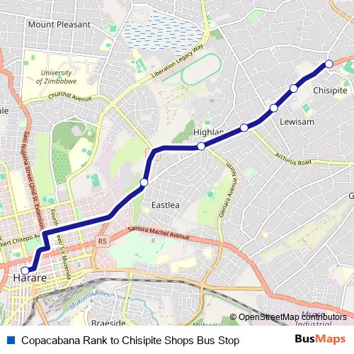 Copacabana Rank to Chisipite Shops Bus Stop bus Route Map