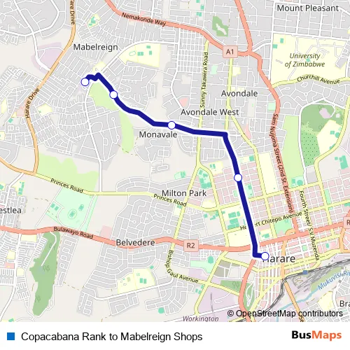 The first stop of the Copacabana Rank to Mabelreign Shops bus route is Corner Jason Moyo Avenue & Mbuya Nehanda Street and the last stop is Malbereign Hub. Copacabana Rank to Mabelreign Shops (Copacabana Rank to Mabelreign Shops) is operational during everyday.