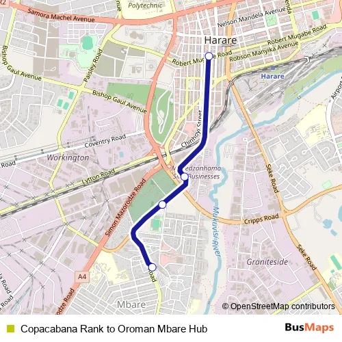 Additional information: Copacabana Rank to Oroman Mbare Hub has 4 stops and the total trip duration