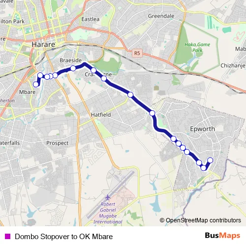 See why over 2 million users trust and consider busmaps.com as the best public transport website. busmaps gives you Harare Buses suggested routes, real-time bus tracker, line route maps in Harare, and helps to find the closest Dombo Stopover to OK Mbare bus stops near you. No internet available? Download an offline PDF map and bus schedule for the Dombo Stopover to OK Mbare bus to take on your trip.
