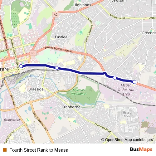 Fourth Street Rank to Msasa bus Route Map