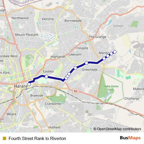 See why over 2 million users trust and consider busmaps.com as the best public transport website. busmaps gives you Harare Buses suggested routes, real-time bus tracker, line route maps in Harare, and helps to find the closest Fourth Street Rank to Riverton bus stops near you. No internet available? Download an offline PDF map and bus schedule for the Fourth Street Rank to Riverton bus to take on your trip.