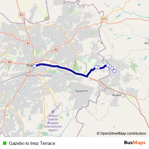 See why over 2 million users trust and consider busmaps.com as the best public transport website. busmaps gives you Harare Buses suggested routes, real-time bus tracker, line route maps in Harare, and helps to find the closest Gazebo to Inez Terrace bus stops near you. No internet available? Download an offline PDF map and bus schedule for the Gazebo to Inez Terrace bus to take on your trip.