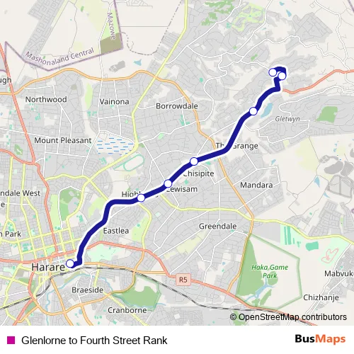 See why over 2 million users trust and consider busmaps.com as the best public transport website. busmaps gives you Harare Buses suggested routes, real-time bus tracker, line route maps in Harare, and helps to find the closest Glenlorne to Fourth Street Rank bus stops near you. No internet available? Download an offline PDF map and bus schedule for the Glenlorne to Fourth Street Rank bus to take on your trip.