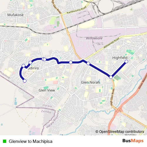Bus Glenview to Machipisa in Harare: Stops & Timetable