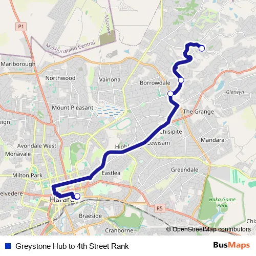 See why over 2 million users trust and consider busmaps.com as the best public transport website. busmaps gives you Harare Buses suggested routes, real-time bus tracker, line route maps in Harare, and helps to find the closest Greystone Hub to 4th Street Rank bus stops near you. No internet available? Download an offline PDF map and bus schedule for the Greystone Hub to 4th Street Rank bus to take on your trip.