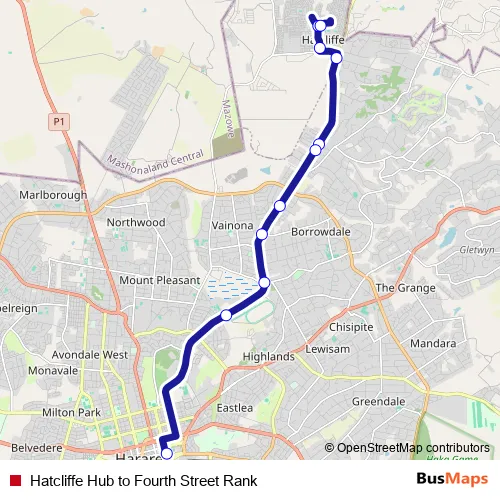 See why over 2 million users trust and consider busmaps.com as the best public transport website. busmaps gives you Harare Buses suggested routes, real-time bus tracker, line route maps in Harare, and helps to find the closest Hatcliffe Hub to Fourth Street Rank bus stops near you. No internet available? Download an offline PDF map and bus schedule for the Hatcliffe Hub to Fourth Street Rank bus to take on your trip.