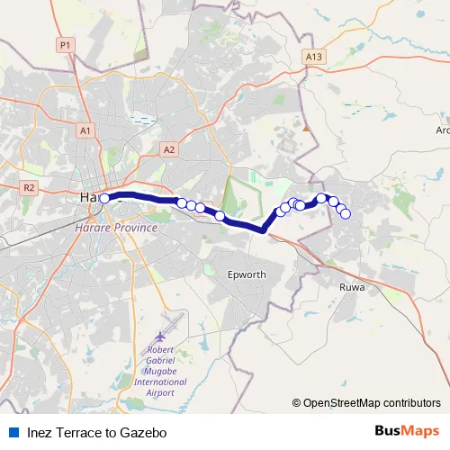 See why over 2 million users trust and consider busmaps.com as the best public transport website. busmaps gives you Harare Buses suggested routes, real-time bus tracker, line route maps in Harare, and helps to find the closest Inez Terrace to Gazebo bus stops near you. No internet available? Download an offline PDF map and bus schedule for the Inez Terrace to Gazebo bus to take on your trip.
