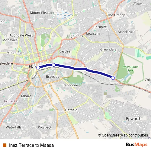 The first stop of the Inez Terrace to Msasa bus route is Inez Terrance Hub and the last stop is Msasa, Union Hardware. Inez Terrace to Msasa (Inez Terrace to Msasa) is operational during everyday.