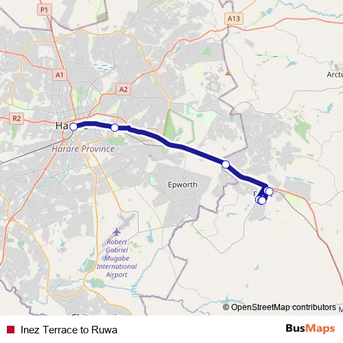 See why over 2 million users trust and consider busmaps.com as the best public transport website. busmaps gives you Harare Buses suggested routes, real-time bus tracker, line route maps in Harare, and helps to find the closest Inez Terrace to Ruwa bus stops near you. No internet available? Download an offline PDF map and bus schedule for the Inez Terrace to Ruwa bus to take on your trip.