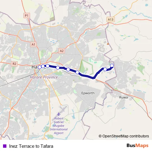 See why over 2 million users trust and consider busmaps.com as the best public transport website. busmaps gives you Harare Buses suggested routes, real-time bus tracker, line route maps in Harare, and helps to find the closest Inez Terrace to Tafara bus stops near you. No internet available? Download an offline PDF map and bus schedule for the Inez Terrace to Tafara bus to take on your trip.