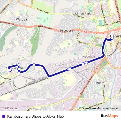Harare Kombis Kambuzuma 3 Shops to Albion Hub bus Route Map