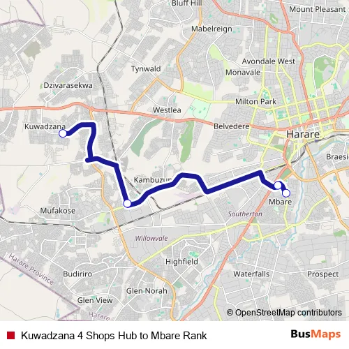 Additional information: Kuwadzana 4 Shops Hub to Mbare Rank has 4 stops and the total trip duration