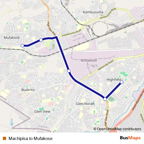 The first stop of the Machipisa to Mufakose bus route is Machipisa Shops and the last stop is Mufakose. Machipisa to Mufakose (Machipisa to Mufakose) is operational during everyday.
