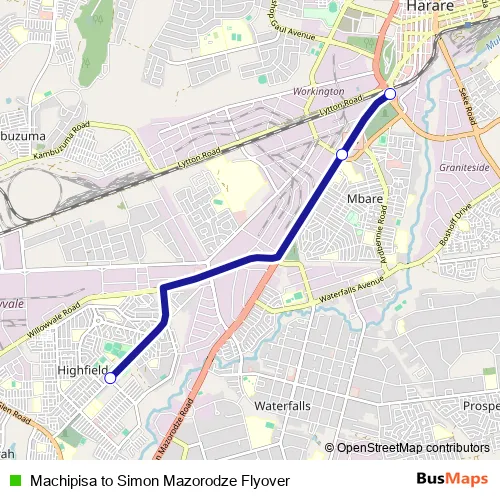 The first stop of the Machipisa to Simon Mazorodze Flyover bus route is OK Machipisa and the last stop is Simon Mazorodze Flyover. Machipisa to Simon Mazorodze Flyover (Machipisa to Simon Mazorodze Flyover) is operational during everyday.