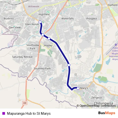 See why over 2 million users trust and consider busmaps.com as the best public transport website. busmaps gives you Harare Buses suggested routes, real-time bus tracker, line route maps in Harare, and helps to find the closest Mapuranga Hub to St Marys bus stops near you. No internet available? Download an offline PDF map and bus schedule for the Mapuranga Hub to St Marys bus to take on your trip.