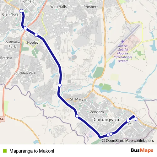 See why over 2 million users trust and consider busmaps.com as the best public transport website. busmaps gives you Harare Buses suggested routes, real-time bus tracker, line route maps in Harare, and helps to find the closest Mapuranga to Makoni bus stops near you. No internet available? Download an offline PDF map and bus schedule for the Mapuranga to Makoni bus to take on your trip.