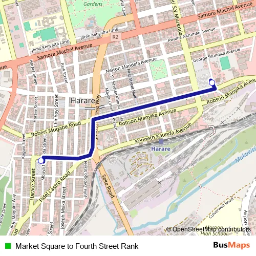 See why over 2 million users trust and consider busmaps.com as the best public transport website. busmaps gives you Harare Buses suggested routes, real-time bus tracker, line route maps in Harare, and helps to find the closest Market Square to Fourth Street Rank bus stops near you. No internet available? Download an offline PDF map and bus schedule for the Market Square to Fourth Street Rank bus to take on your trip.