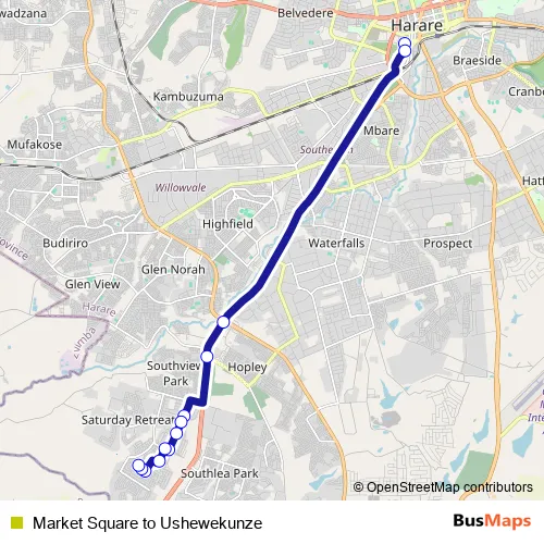 The first stop of the Market Square to Ushewekunze bus route is Market Square and the last stop is Southgate 24hr Clinic. Market Square to Ushewekunze (Market Square to Ushewekunze) is operational during everyday.