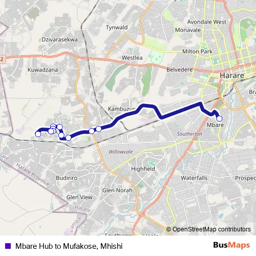 Additional information: Mbare Hub to Mufakose, Mhishi has 11 stops and the total trip duration