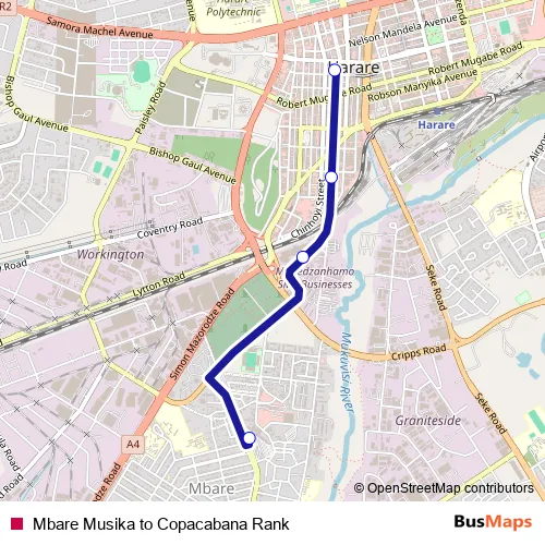 Additional information: Mbare Musika to Copacabana Rank has 4 stops and the total trip duration for this route is approximately 12 minutes.