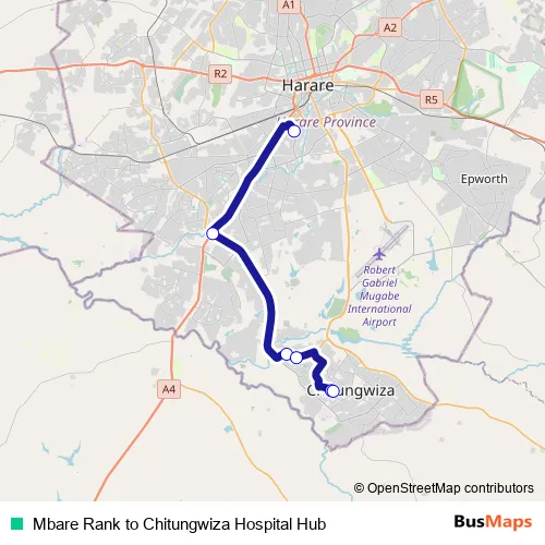 Mbare Rank to Chitungwiza Hospital Hub bus Route Map