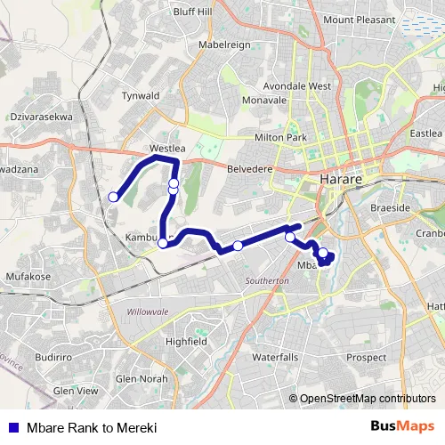 Additional information: Mbare Rank to Mereki has 7 stops and the total trip duration for this route is approximately 66 minutes.