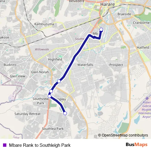 See why over 2 million users trust and consider busmaps.com as the best public transport website. busmaps gives you Harare Buses suggested routes, real-time bus tracker, line route maps in Harare, and helps to find the closest Mbare Rank to Southleigh Park bus stops near you. No internet available? Download an offline PDF map and bus schedule for the Mbare Rank to Southleigh Park bus to take on your trip.