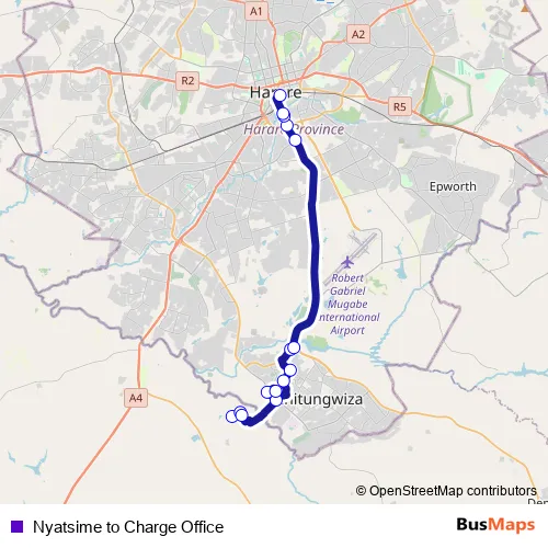 See why over 2 million users trust and consider busmaps.com as the best public transport website. busmaps gives you Harare Buses suggested routes, real-time bus tracker, line route maps in Harare, and helps to find the closest Nyatsime to Charge Office bus stops near you. No internet available? Download an offline PDF map and bus schedule for the Nyatsime to Charge Office bus to take on your trip.