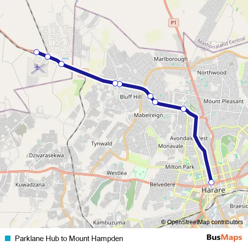 See why over 2 million users trust and consider busmaps.com as the best public transport website. busmaps gives you Harare Buses suggested routes, real-time bus tracker, line route maps in Harare, and helps to find the closest Parklane Hub to Mount Hampden bus stops near you. No internet available? Download an offline PDF map and bus schedule for the Parklane Hub to Mount Hampden bus to take on your trip.