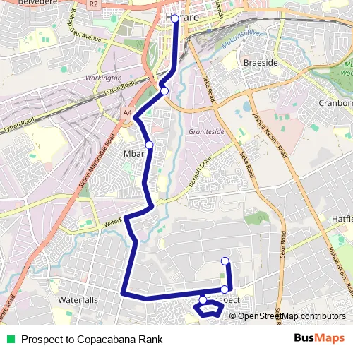 See why over 2 million users trust and consider busmaps.com as the best public transport website. busmaps gives you Harare Buses suggested routes, real-time bus tracker, line route maps in Harare, and helps to find the closest Prospect to Copacabana Rank bus stops near you. No internet available? Download an offline PDF map and bus schedule for the Prospect to Copacabana Rank bus to take on your trip.