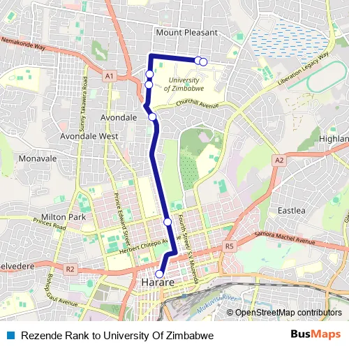 Rezende Rank to University Of Zimbabwe bus Route Map