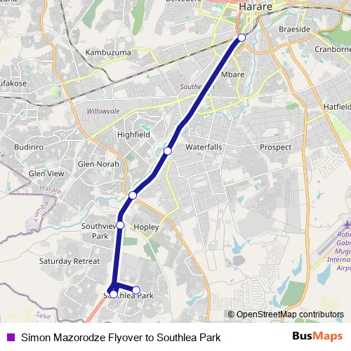 Simon Mazorodze Flyover to Southlea Park bus Route Map