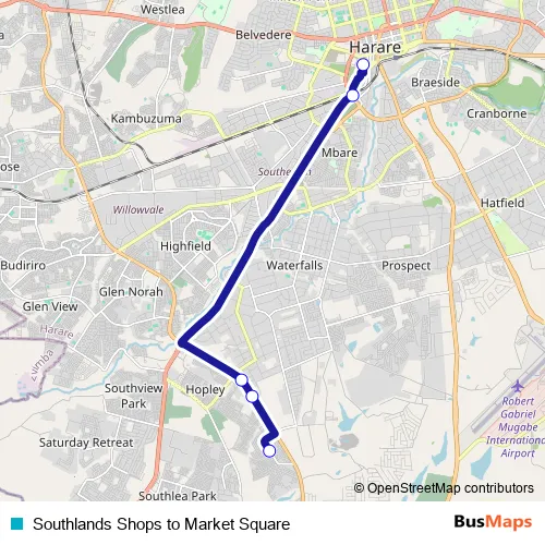 See why over 2 million users trust and consider busmaps.com as the best public transport website. busmaps gives you Harare Buses suggested routes, real-time bus tracker, line route maps in Harare, and helps to find the closest Southlands Shops to Market Square bus stops near you. No internet available? Download an offline PDF map and bus schedule for the Southlands Shops to Market Square bus to take on your trip.