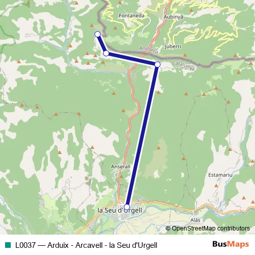 The first stop of the L0037 bus route is Arduix and the last stop is La Seu d'Urgell (estació d'autobusos). L0037 (Arduix - Arcavell - la Seu d'Urgell) is operational during todos los días.