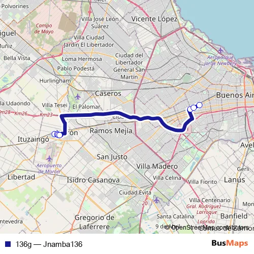 See why over 2 million users trust and consider busmaps.com as the best public transport website. busmaps gives you Moron Buses suggested routes, real-time bus tracker, line route maps in Moron, and helps to find the closest 136g bus stops near you. No internet available? Download an offline PDF map and bus schedule for the 136g bus to take on your trip.