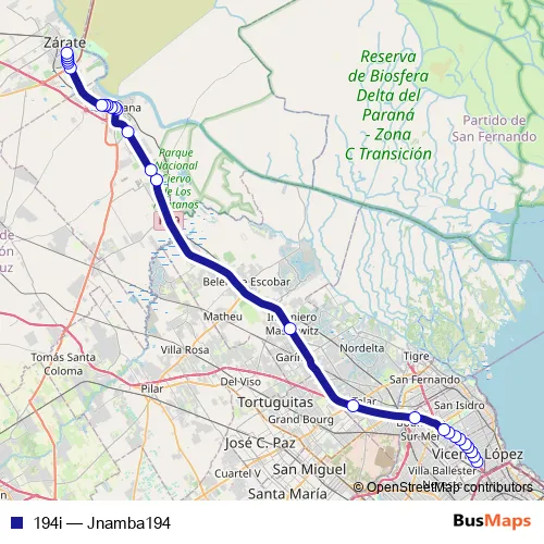 The first stop of the 194i bus route is Autopista Panamericana Y AV. SAN Martin and the last stop is Avenida General Lavalle Y Bernardo DE Irigoyen. 194i (Jnamba194) is operational during todos los días.
