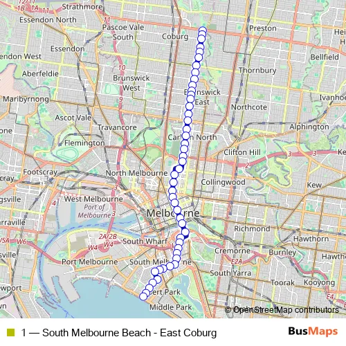 The first stop of the 1 tram route is Bell St/Nicholson St #135 and the last stop is Beaconsfield Pde/Victoria Ave #32. 1 (South Melbourne Beach - East Coburg) is operational during todos los días.