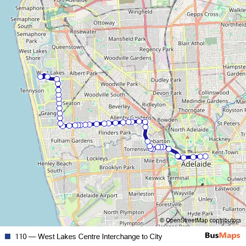 The first stop of the 110 bus route is Stop S1 Grenfell St - South side and the last stop is West Lakes Interchange Terminus. 110 (West Lakes Centre Interchange to City) is operational during todos los días.