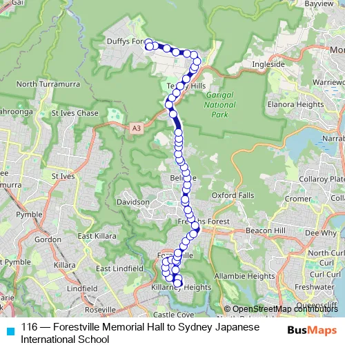 The first stop of the 116 bus route is Forestville Memorial Hall, Starkey St and the last stop is Sydney Japanese School. 116 (Forestville Memorial Hall to Sydney Japanese International School) is operational during entre semana.