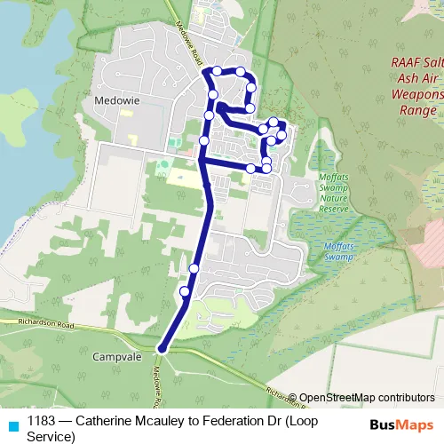 See why over 2 million users trust and consider busmaps.com as the best public transport website. busmaps gives you Medowie Buses suggested routes, real-time bus tracker, line route maps in Medowie, and helps to find the closest 1183 bus stops near you. No internet available? Download an offline PDF map and bus schedule for the 1183 bus to take on your trip.