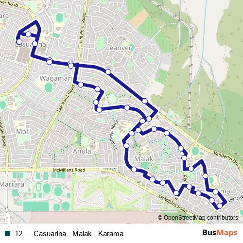 The first stop of the 12 bus route is Casuarina Interchange and the last stop is Casuarina Terminus. 12 (Casuarina - Malak - Karama) is operational during todos los días.