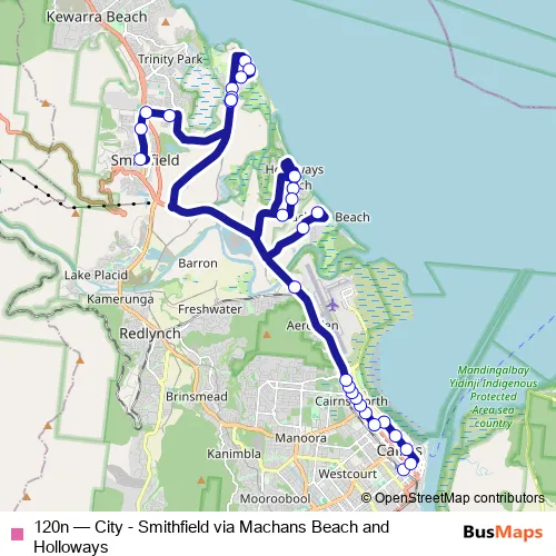 The first stop of the 120n bus route is Cairns Central Shopping Centre (Spence St) and the last stop is Smithfield Shopping Centre (Cattana Rd). 120n (City - Smithfield via Machans Beach and Holloways) is operational during todos los días.